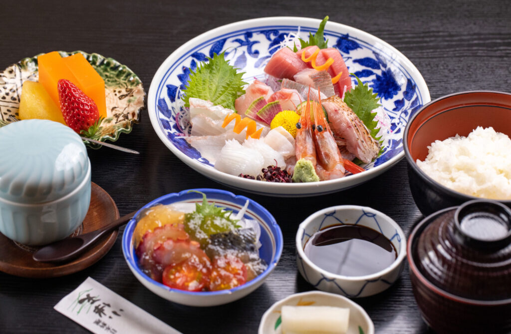 (上刺身盛り合わせ、小鉢、茶碗蒸し、ごはん、漬物、赤だし、フルーツ)